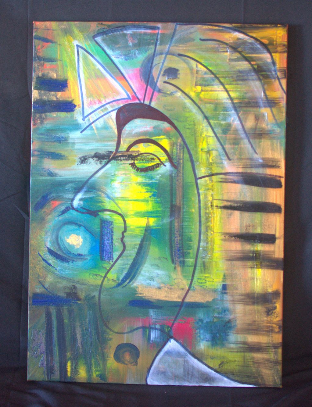 Acrylic and oil pastels on canvas.